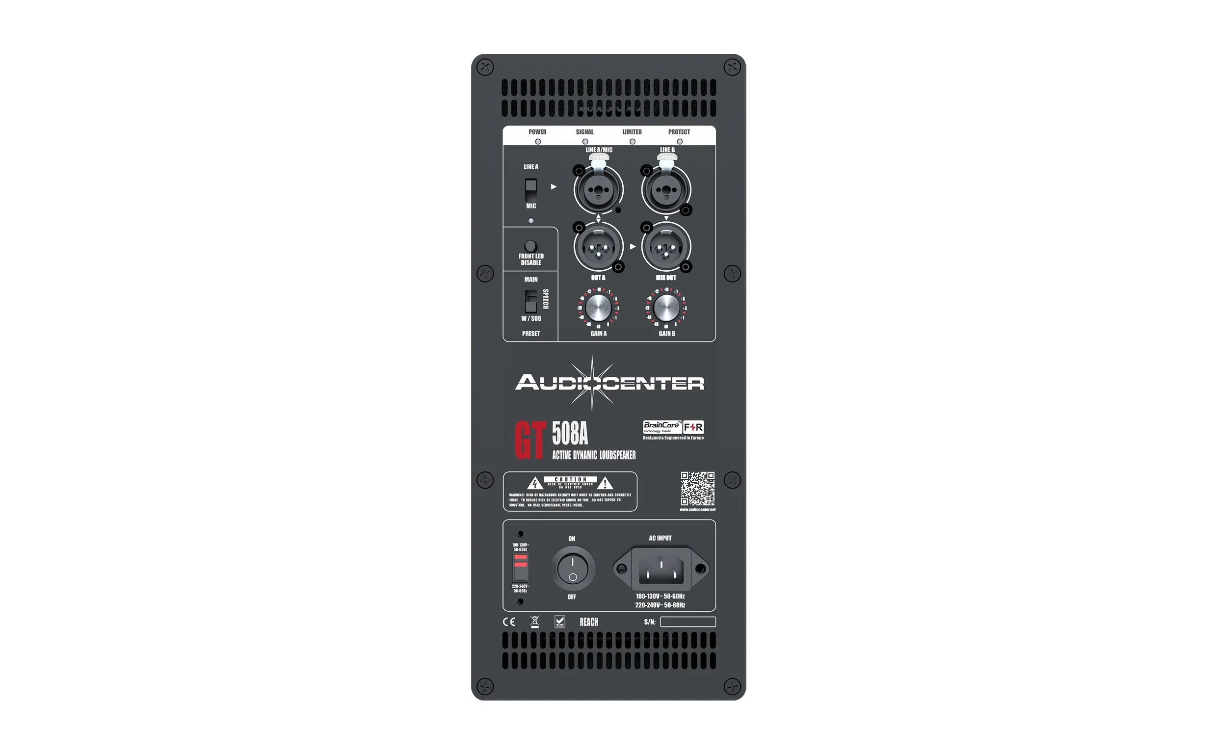 L’enceinte GT508A dispose de deux entrées combinées (XLR 2 voies et jack mono 6,35). L’entrée CH A peut être commutée entre l’entrée ligne symétrique et l’entrée microphone.